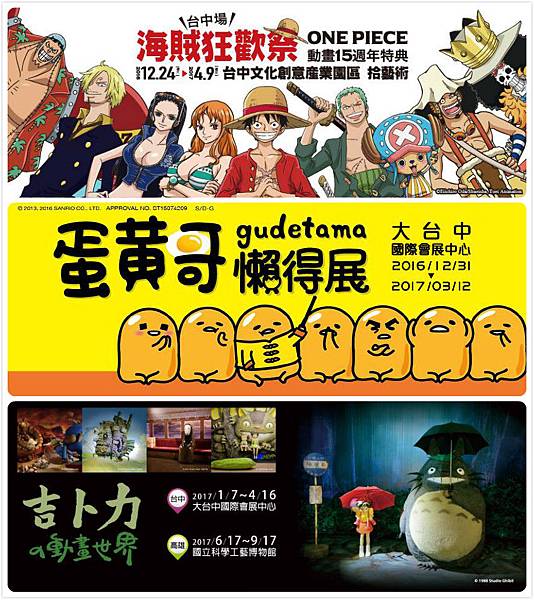 沒錯!新的一年台中可謂眾星雲集,從12/24開始『海賊狂歡季』由立志成為海賊王的男人魯夫打頭陣,緊接著12/31『蛋黃哥懶得展』由懶萌教主蛋黃哥接棒,最後宮崎駿爺爺和其夥伴的『吉卜力的動畫世界』壓軸登場,讓台中2017一開始就星光四射!